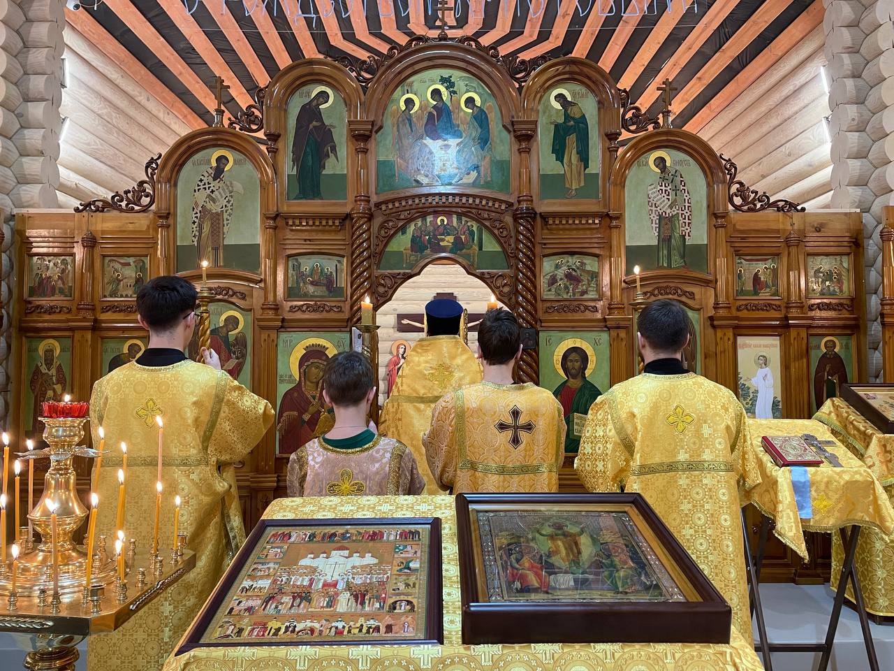 – Нижний ряд: расположены образы чтимых святых и храмовая икона.