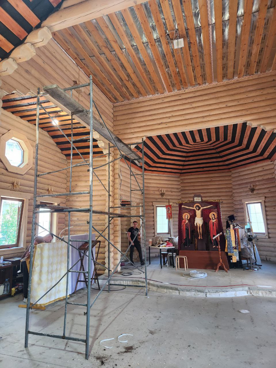 Строительство храма продолжается! Полностью закуплено покрытие для потолков храма - гипсокартонные влагостойкие плиты, на стены установлены новые светильники-бра , сделана сантехника в алтаре и в техпомещении для церковнослужителей.